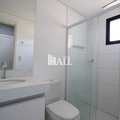 Banheiros possuem gabinetes, espelhos e box de vidro.
